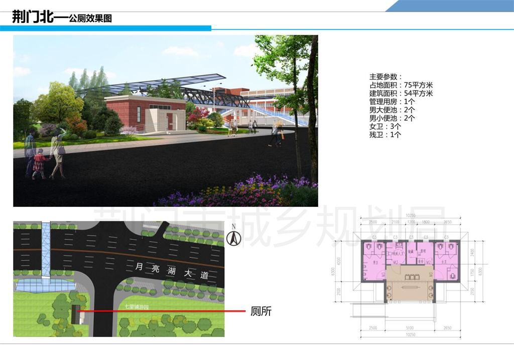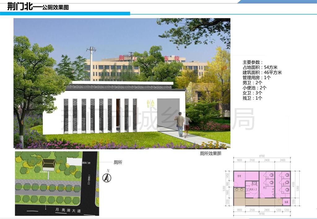 市建管中心申报的16个新建公厕方案分布于---①象山景区新建公厕2所,艺林园公厕建筑面积98.4平方米,在象山景区中部;南入口公厕建筑面积105.3平方米。②植物园公厕建筑面积83.2平方米;凤凰湖公厕2座,建筑面积均为83.2平方米;东宝山公厕建筑面积83.2平方米。③沿竹皮河河道4座公厕,分别为:浏河半岛公厕建筑面积45平方米,乐民公园公厕建筑面积45平方米,夏家湾生态半岛公厕建筑面积45平方米,象山三路公厕建筑面积118平方米;沿杨树港河道3座公厕,分别为:乐活花园公厕建筑面积45平方米,福耀二路公厕建筑面积45平方米;王林港干流处公厕建筑面积36.8平方米。④沿荆门北高速出入口两侧3座,分别为:七里铺社区公厕建筑面积54平方米;荆门二医公厕建筑面积46平方米;光荣院游园公厕建筑面积46平方米。
