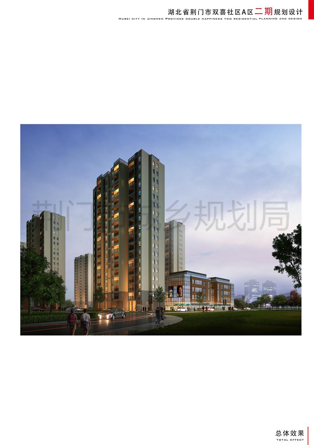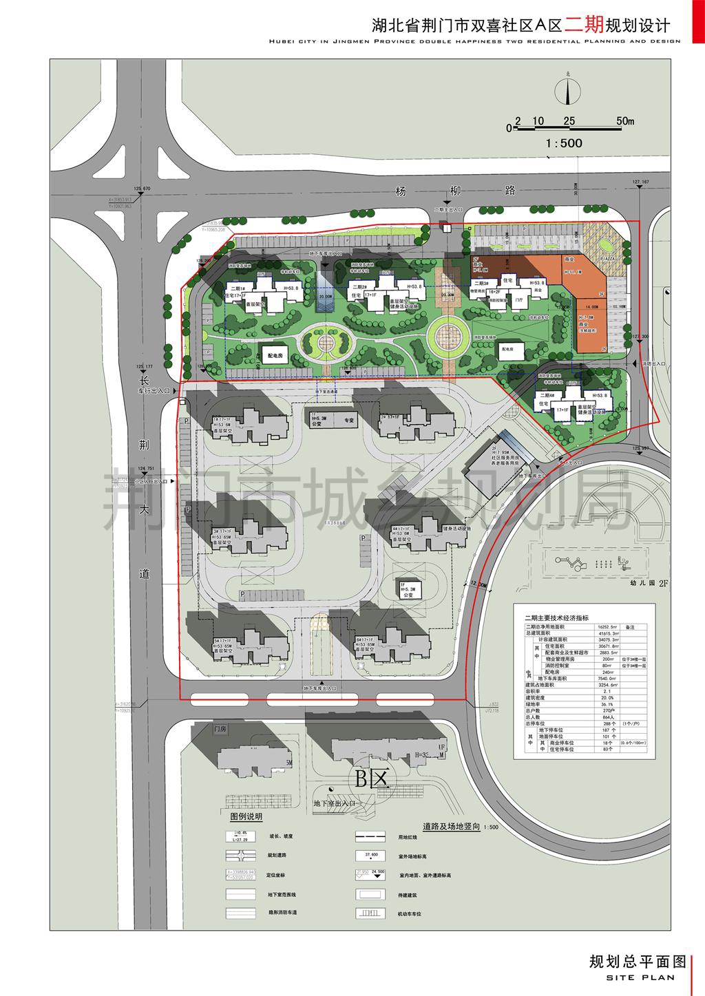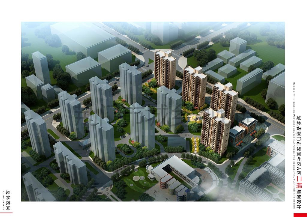 湖北荆门城建集团房地产开发有限公司申报的双喜社区A区规划方案调整及A区二期建筑方案位于长荆大道以东、杨柳路以南、荆山大道以西、香樟路以北。双喜社区A区二期规划净用地面积16252.5㎡,总建筑面积为41615.3㎡,计容建筑面积为34075.3㎡,不计容地下室建筑面积为7540㎡,容积率2.1。新增住宅270套,新调整的地下室与南侧地下室连通。调整后双喜社区A区容积率2.0。